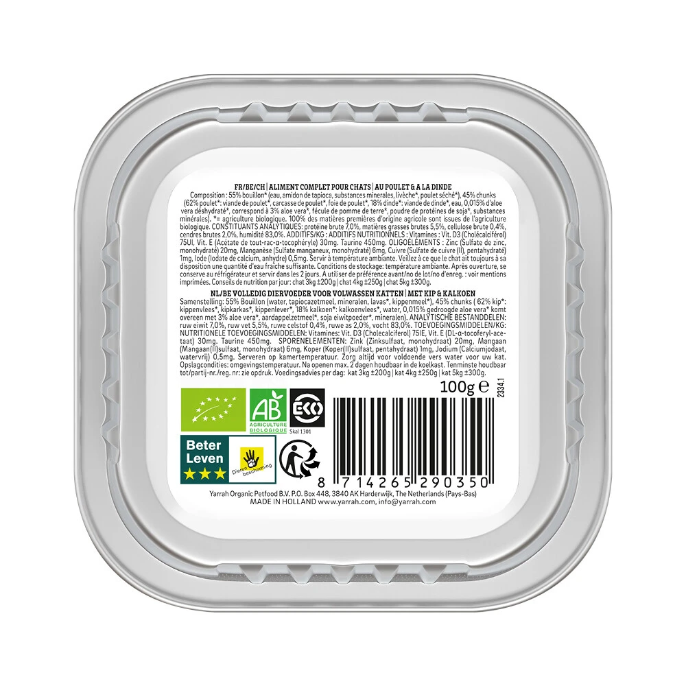 Yarrah Bio Kattenvoer Chunks Kip – KalkoenGraanvrije chunks met biologische kip en kalkoen, aangevuld met biologisch gecertificeerde aloë vera. Geschikt voor alle kattensoorten en leeftijden, van kittens tot senior katten. Het biologische natvoer vormt een complete, voedzame en zeer smakelijke maaltijd voor je kat. Dit 100 grams alu-kuipje bevat zowel biologische kip als kalkoen. De biologische kippen en kalkoenen verwerkt in het voer hebben een beter leven gehad, waarbij ze buiten hebben m