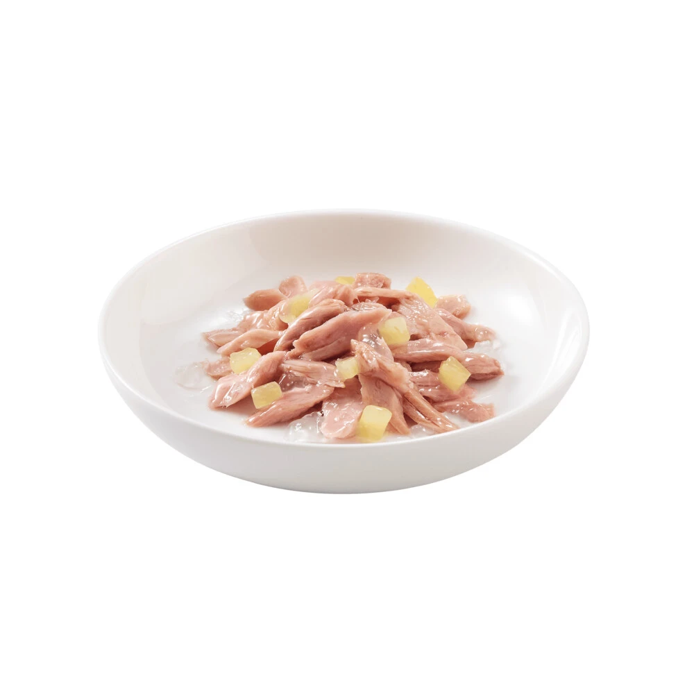 Schesir Kattenvoer Tonijn – Ananas in GeleiHet recept is op basis van echte, heerlijke tonijnfilets gecombineerd met echte stukjes ananas, dorstlessend en gewaardeerd exotisch fruit, voor een heerlijke en originele maaltijd. In gelatine bereid, om de voorkeur tegemoet te komen van katten die houden van een verfijnde, natuurlijke smaak in combinatie met een compactere consistentie in de kom.Schesir is het eerste merk dat echte stukjes fruit toevoegt aan de blikjes kattenvoer, gebaseerd op de stud