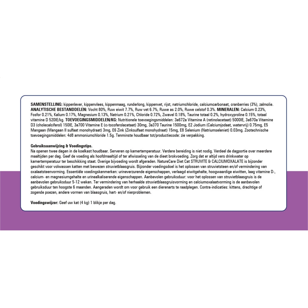 Prins Prins NatureCare Dieet Struvite & Calciumoxalate Kat NatvoerNatureCare Veterinary Diet Cat Struvite & Calciumoxalate is een natvoeding speciaal voor katten met blaasproblemen. Deze speciale dieetvoeding is ontwikkeld in samenwerking met dierenartsen en heeft zowel een oplossend als preventief karakter. Deze dieetvoeding is geschikt ter voorkoming van herhaalde struviet- en calciumoxalaatblaasgruis. Een natvoeding zorgt voor een verhoogde vochtopname bij de kat, waardoor de hoeveelh