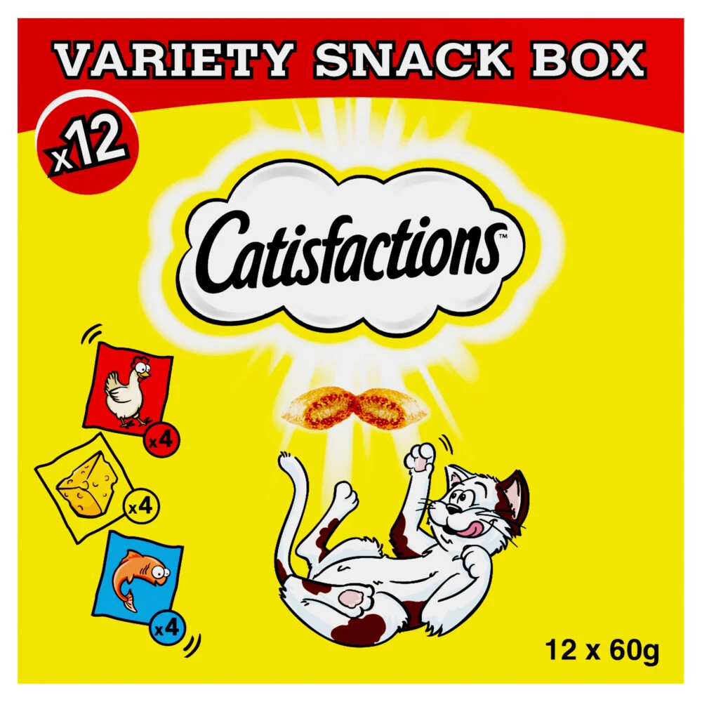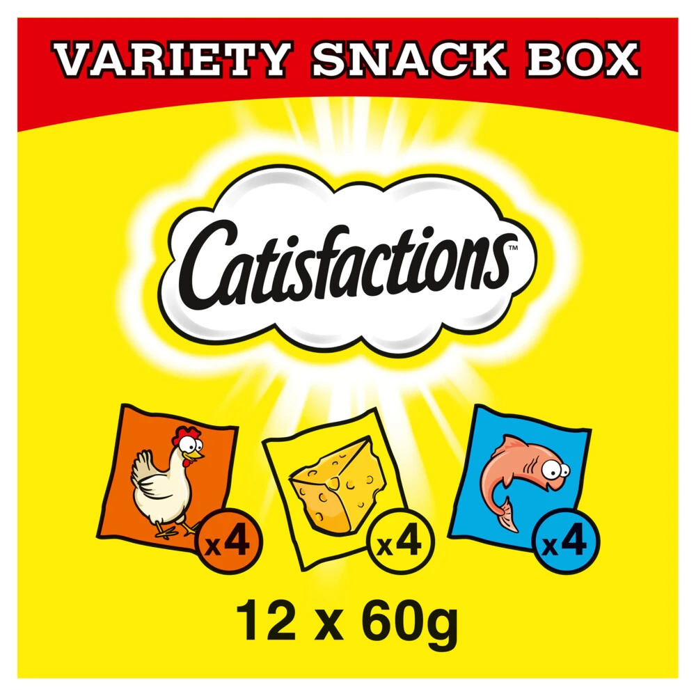 Catisfactions Kattensnacks MegaboxCatisfactions bevatten minder dan 2 Kcal per stuk en kunnen op ieder moment van de dag gegeven worden. Advies is om je kat tot 20 Catisfactions brokjes per dag te geven. Je kat krijgt dan 8,4% van zijn dagelijkse behoefte aan kilocalorieën binnen. Zorg ook dat er altijd vers drinkwater in de buurt is.Met zalm, kip en kaas smaakKrokante buitenkantZachte kern
