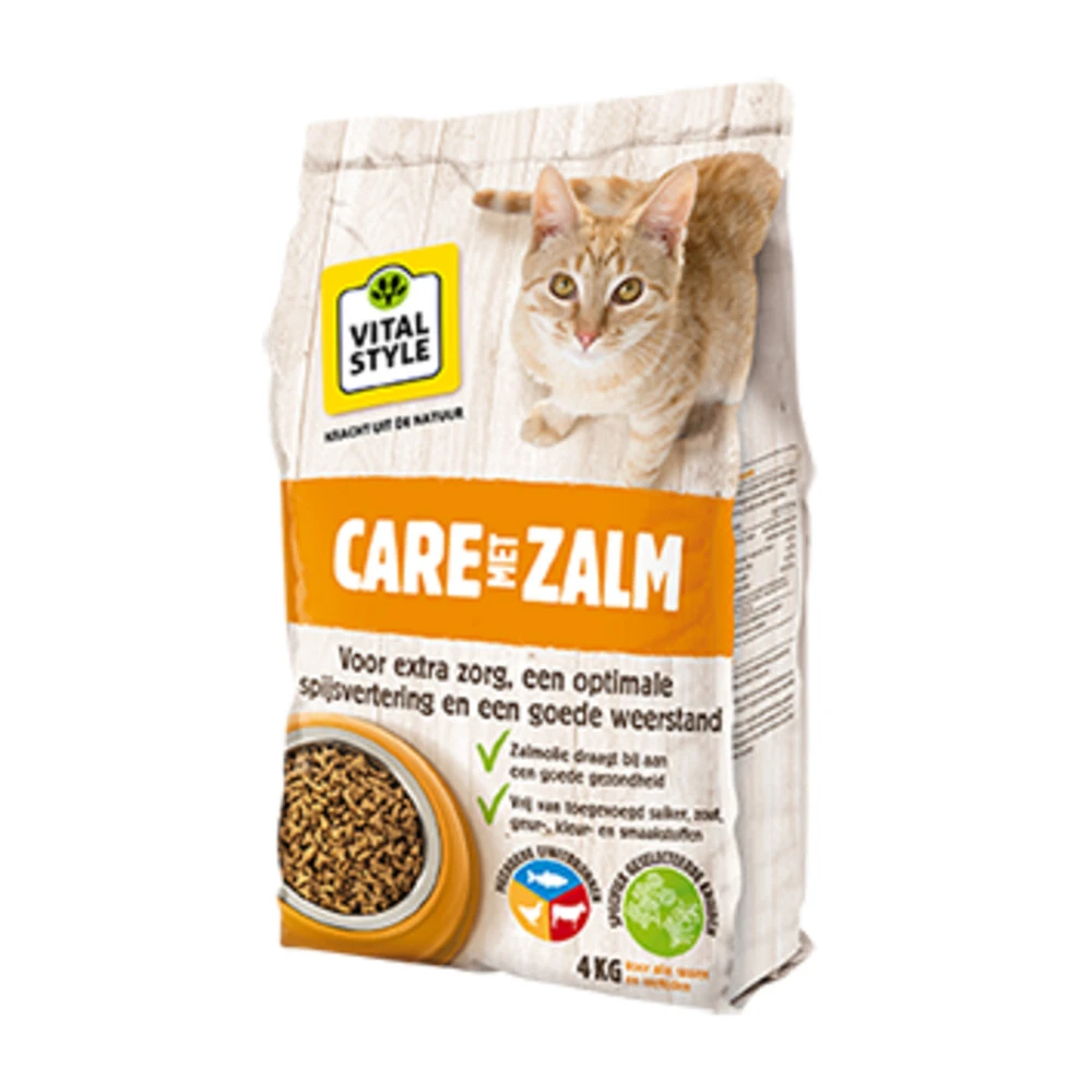 VITALstyle Kattenvoer Care Zalm VITALstyle (voorheen ECOstyle) care met zalm kattenbrokjesBevat alles wat je kat nodig heeft, van jong tot oud. Voor een goede gezondheid van je kat is een actieve, goed werkende spijsvertering belangrijk. De goed verteerbare ingrediënten in de voeding zorgen voor een actieve spijsvertering. Door de vezels in de voeding verlaten de kattenharen op een natuurlijke manier het lichaam. De zalmolie heeft een gunstige invloed op de gezondheid en de voeding bev